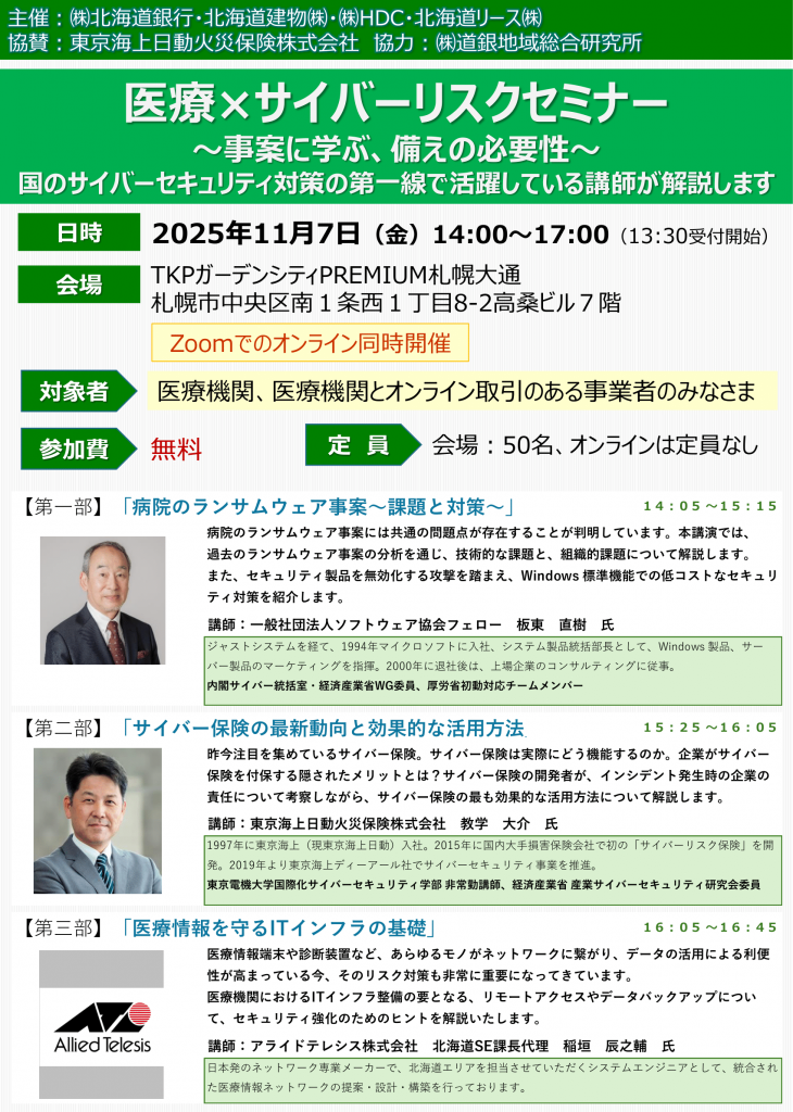 2025年11月7日、株式会社北海道銀行様、北海道建物株式会社様、北海道リース株式会社様、そして当社の4社共催による「医療×サイバーリスクセミナー ~事案に学ぶ、備えの必要性~」を開催いたします。
